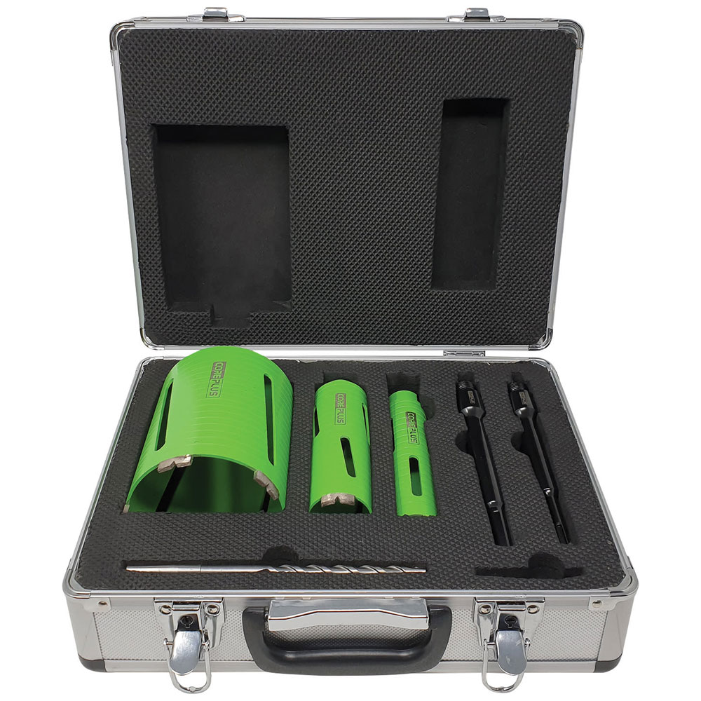 This 7 piece CorePlus Diamond Dry Core Drill Bit Set is supplied in a sturdy aluminium storage case.