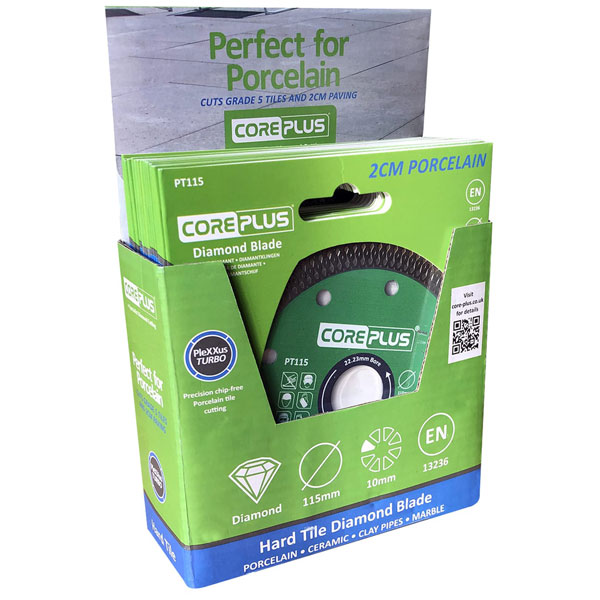CorePlus Porcelain Diamond Blade CDU with 15 CorePlus Porcelain Diamond Blades. Each blade has an ultra-thin, continuous PleXXus Turbo rim segment for precision chip-free porcelain tile cutting. Suitable for cutting grade 5 Porcelain tiles and grade 5 Porcelain 2cm paving.