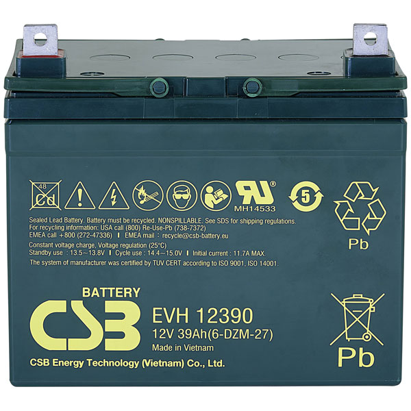 The CSB Battery EVH12390 is a maintenance-free VRLA battery with a high number of charge cycles and low self-discharge levels. It features a 12 V, 39 Ah AGM configuration and measures 196 x 178 x 155 mm with an M6 connector. This lead-acid battery is ideal for backup power systems, uninterruptible power supplies, and telecommunications equipment.