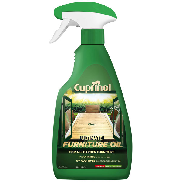 Cuprinol Ultimate Furniture Oil Clear Spray has a special formulation that provides longer-lasting protection than traditional Teak Oil and works in 3 ways: prepares, colours and enhances. With added wax for superior water repellence, protecting it from the weather.
