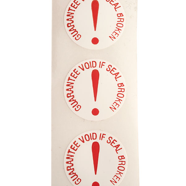 Circular 'tamperproof' self adhesive vinyl label, with legend GUARANTEE VOID IF SEAL BROKEN, for use on equipment.