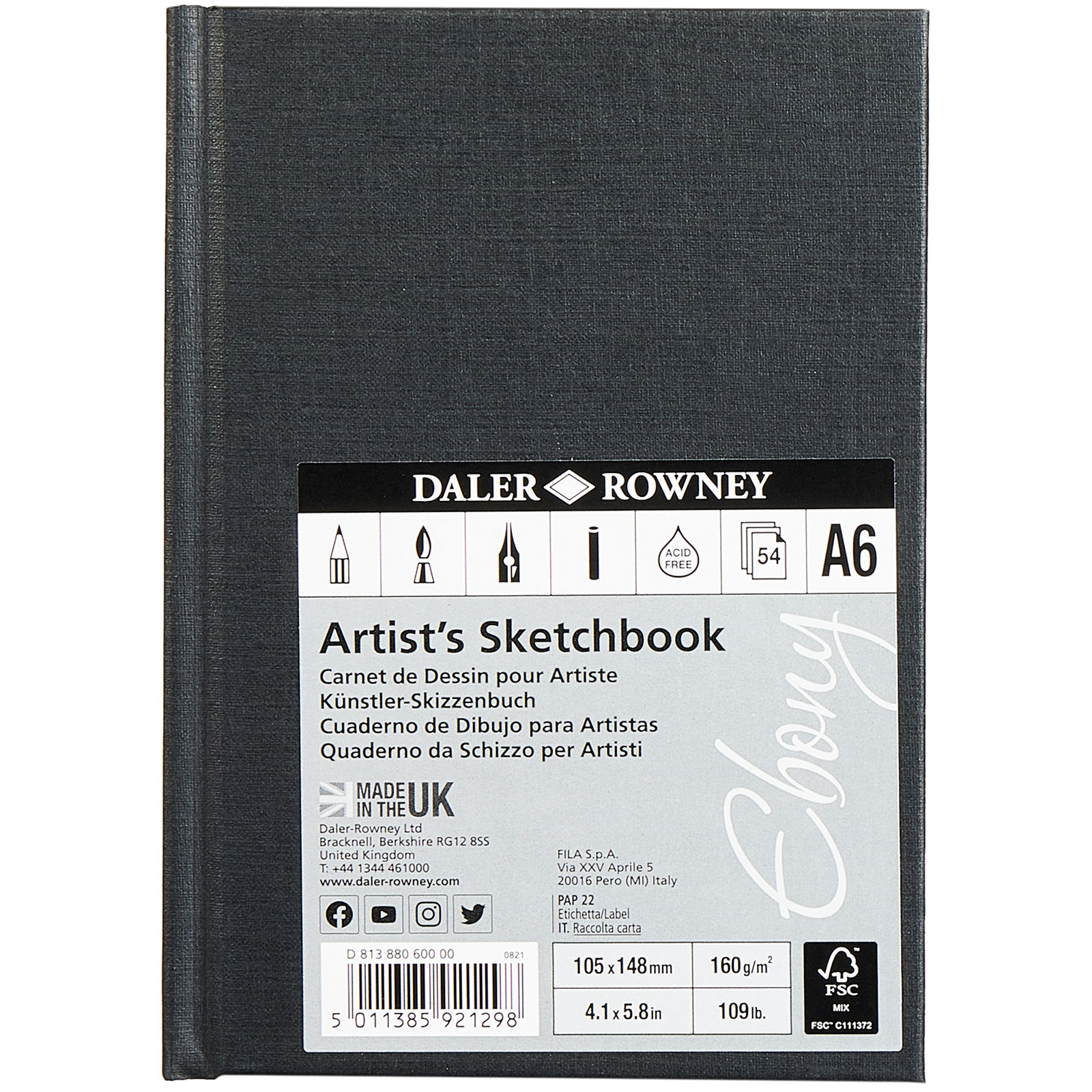 Daler-Rowney D81388060000 Ebony H/B Sketchbook A6 Portrait 160g 54 sheets Daler-Rowney Ebony perfect bound hardback sketchbook A6 portrait contains 54 sheets of acid-free, crisp natural white 160gsm cartridge paper. This hardback sketchbook is perfect bound on the long edge to create a portrait format presentation.
