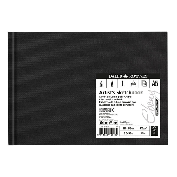 Daler-Rowney D833110500 Ebony Extra White H/B Sketchbook A5 Landscape 130g 46 Sheets Daler-Rowney Ebony Extra White hardback sketchbook A5 landscape featuring 46 sheets of acid-free, crisp bright white 130gsm FSC® (FSC-C111372) certified cartridge paper.