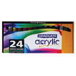Daler Rowney Graduate Acrylic Paint Introduction Set featuring 24 bright and strong colours which are easy to brush onto a variety of surfaces including paper, primed board and canvas. The paint is suitable for use indoors and out. Graduate Acrylic colours are of good pigment strength and flow easily across paper and primed surfaces. The advantage of acrylic colours is that artwork can be dried and stored away shortly after an art class has been completed, and will not smudge if water is spilled on the surface of the painting. Paper and canvas coated with Graduate Acrylic Paint can be loosely rolled and stored without fear of cracking.