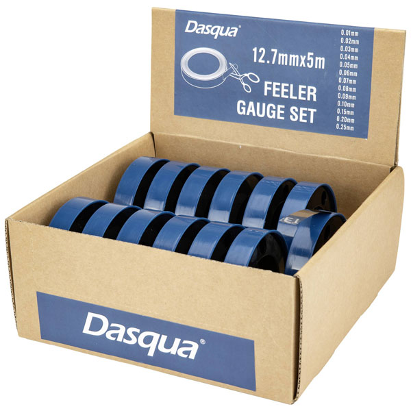 The Dasqua 1803-0105 Feeler Gauge Shim Roll Set comprises 13 rolls, each 5 metres in length, with precise thickness options from 0.01 mm to 0.25 mm. Manufactured by Dasqua, it is an essential tool for accurate gap measuring with various applications, including adjusting spark plugs and valve shims. This set is ideal for precision engineering and maintenance tasks requiring exact measurements.