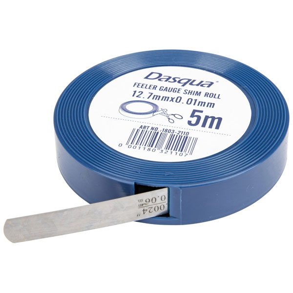 The Dasqua 1803-2110 Stainless Steel Feeler Gauge Shim Roll is a durable tool designed for precise measurements. Made from high-quality stainless steel, it ensures long-lasting performance and resistance to rust. It is typically used for adjusting and measuring gaps in various applications, such as spark plug gaps in engines.