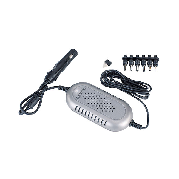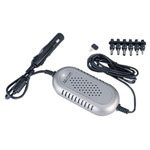 Universal laptop power supply with adjustable 15-24V output. Input for use in cars. Including 6 secondary plugs to fit most laptop PCs.