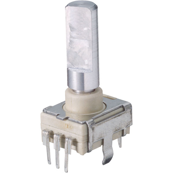 A miniature 2-bit encoder with an end switch. SMD mounting with vertical orientation. Suitable for setting digital values in devices. Pressing the shaft end switch can be used, for example, to select an additional pulse for a set/reset function.