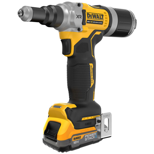 DEWALT DCF414 XR 1/4in Riveter with a tool-free nose piece and powerful brushless motor delivers longer run times, less maintenance and better power control. Its 30mm stroke length allows for fastening rivets in one stroke. Suitable for installing aluminium, steel and stainless steel blind rivets up to 6.3mm. The on-board mandrel collector store spent mandrels. Fitted with an ergonomic comfort grip handle for increased balance and tool control. There is also a bright integrated LED work light that enhances the work area in low light areas.