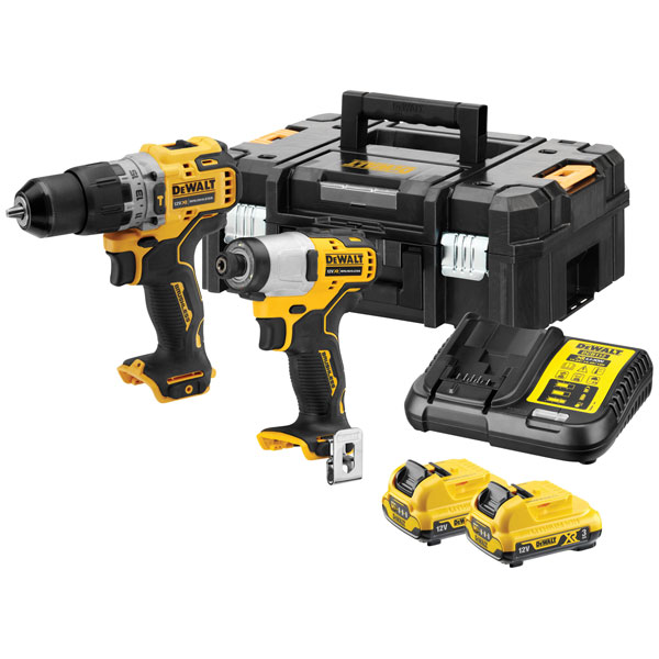 The DEWALT DCK2111L2T XR Brushless Sub-Compact Twin Pack, contains the following: