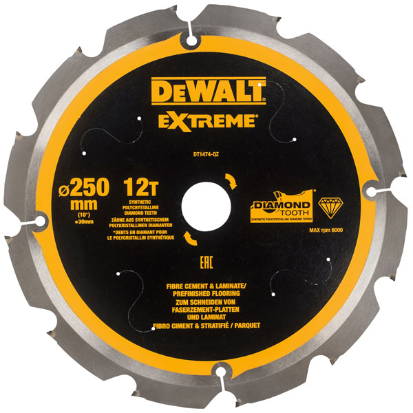 The DEWALT Extreme Cement Saw Blade features synthetic PCD (Polycrystalline Diamond) tipped teeth. These PCD coated teeth provide 100% longer life in fibre cement than TCT tipped blades. The laser cut blade features anti-vibration body slots and precision ground tips. The blade design also helps to reduce dust production when cutting fibre cement materials.