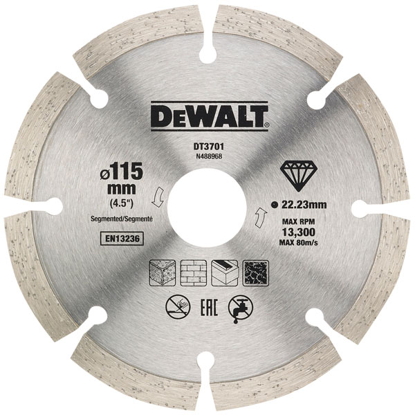 The DEWALT Dry Diamond Blade for dry cutting general masonry materials, such as brick, building blocks, paving blocks concrete. Universal fit for ALL brands of angle grinders. For use with corded and cordless grinders.