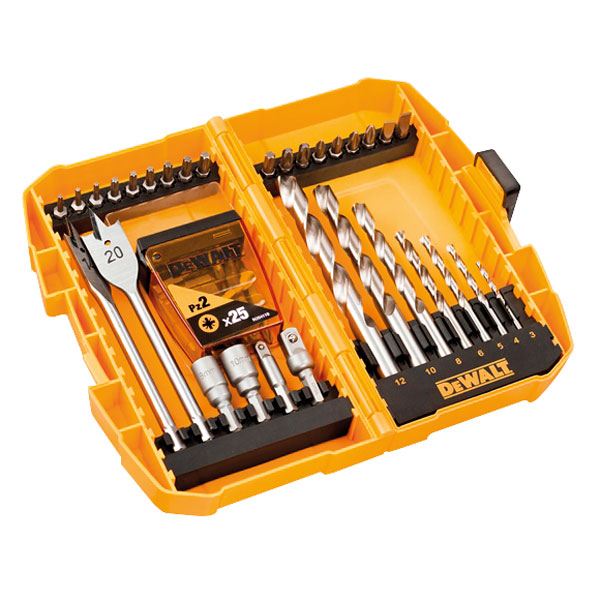 This 56-piece drilling and screwdriving set from DeWalt is ideal for wood drilling, metal drilling and screwdriving applications. It comes in a medium size tough case for convenient storage and portability of the high quality professional screwdriver bits - designed with a flexible torsion zone to absorb torque peaks and reduce breakage.