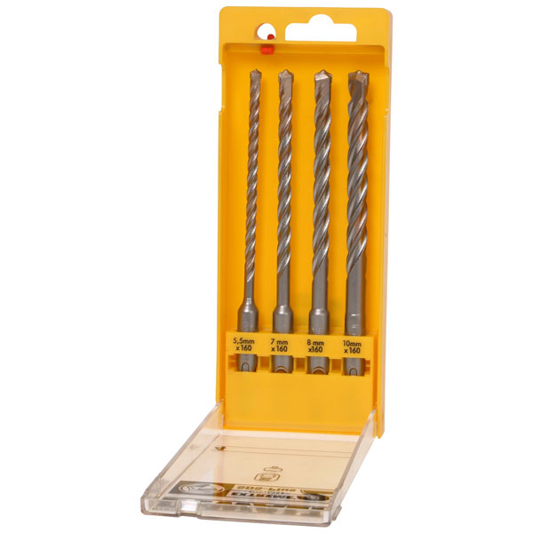 This 4-piece SDS Plus drill bit set from DeWalt is suitable for fast drilling of plug, anchor or clearance holes in masonry, stone, concrete and brick/block work.