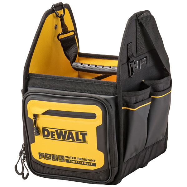 DEWALT DWST60105 Pro Electrician's Tote with 34 pockets, it can carry a wide range of tools and power tool accessories. An IP54 water-resistant welded compartment provides safe storage for important items. Made from high-quality, dirt repellent 1680D fabric. With re-enforced stitching to increase durability and hold its shape over time. Its waterproof injected plastic base protects tools from tough worksite environments. Ergonomic handles and a padded shoulder strap make it easy to carry.