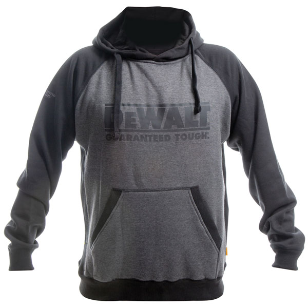 The DEWALT Stratford Hooded Sweatshirt is a warm garment, ideal for those colder days at work. It has a large kangaroo front pocket and draw corded hood. The design features a large DEWALT logo across the chest.