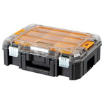 This clear lid organiser from DeWalt has 2 large and 5 small removable storage cups for storing small parts and accessories. Its unique heavy-duty lid design locks all compartments in place for secure storage. A built-in wide handle allows easy and stable portability, whilst the clear and impact resistant lid allows full visibility for quick access. The organiser has strong, tough metal latches and metal hinges for heavy-duty use. Side latches allow it to be connected to other TSTAK organisers/boxes for easy carrying and safe stacking.