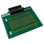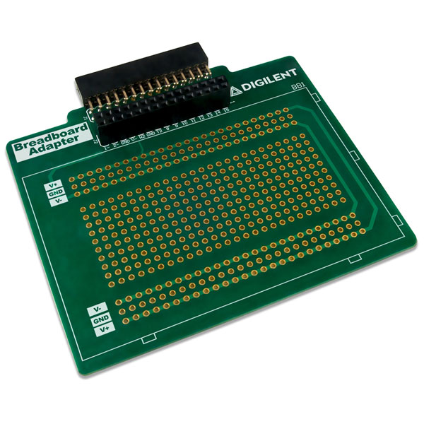 The Breadboard Adaptor is to be used with the Analog Discovery tool, providing a prototyping surface with a secure connections. A female header is provided that passes all connections through from the Analog Discovery 2 and the prototyping surface. The PCB provides two power rails directly routed from the V+ and V- pins on the Analog Discovery. Components and wires can be soldered to the prototyping surface and power rails. Alternatively, the half-sized breadboard can be affixed (permanently) to the adaptor to provide connections.