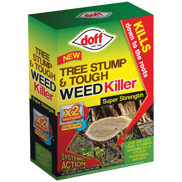 Doff Tree Stump & Tough Weedkiller is a systemic action weedkiller that is carried to all parts of the cut tree stump or weed. It kills weeds down to the root, with effects visible within 7-14 days.