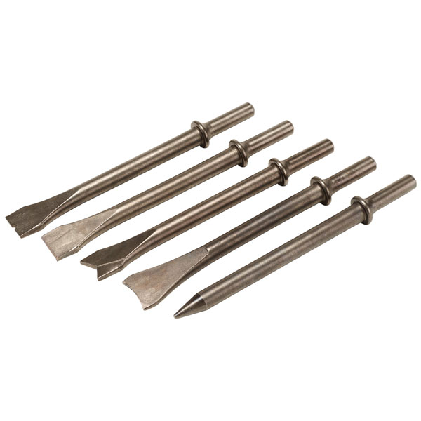 This set of shank chisels includes a taper punch, spot weld chisel, sheet metal trimmer, panel cutter and flat chisel.