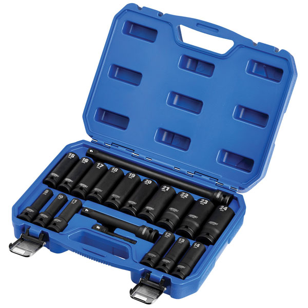 The sockets are in variety of sizes from 8-24mm and the set includes a 125mm and 250mm 1/2" Sq.