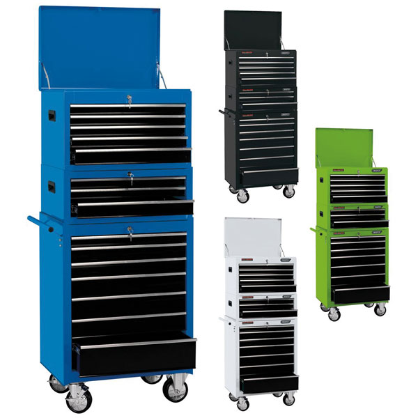 Fifteen drawer combined roller cabinet and tool chest. Attached with braked and swiveling castors and pulling handle for easy manoeuvrability. Manufactured from sheet steel with a protective powder coated finish. Drawers are fitted with ball bearing runners delivering a smooth operation and a secure locking system with two keys. Carton packed on pallet.