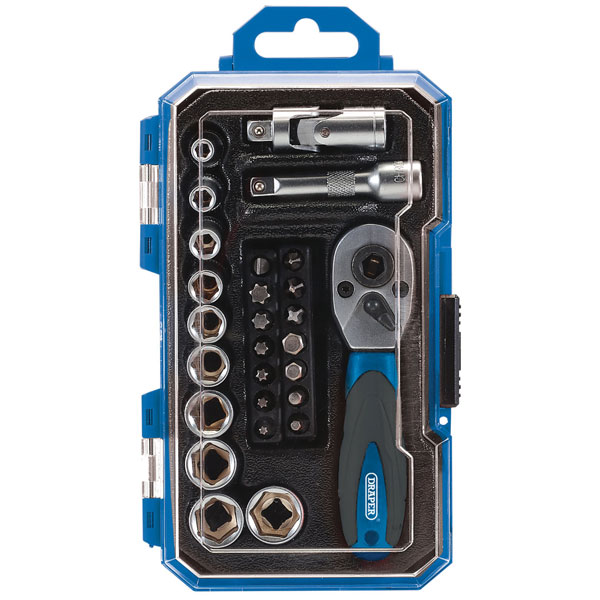 This 1/4" square drive socket set includes a 103mm 72-tooth reversible quick-release ratchet, plus a selection of sockets and screwdriver bits.