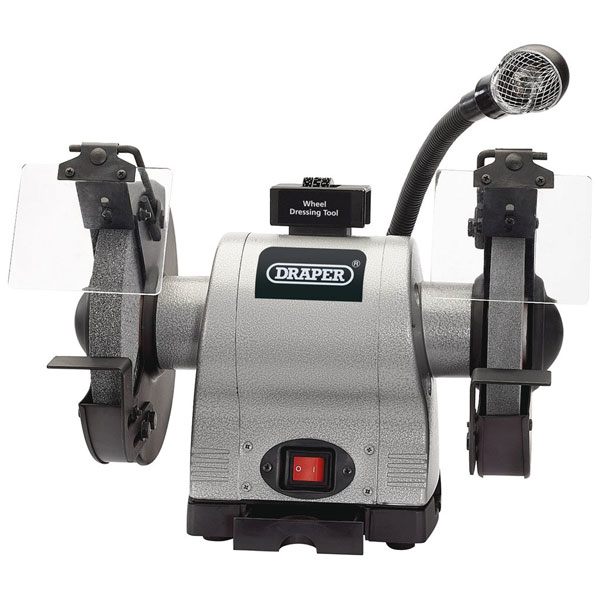 Heavy duty machine with worklight, designed for use in the garage or workshop. One coarse and one fine grinding wheel, adjustable eye protection shields, spark deflectors, wheel guards and tool rests. Supplied with grinding wheel dresser and storage tray. Fitted with approved plug and cable. Display carton.