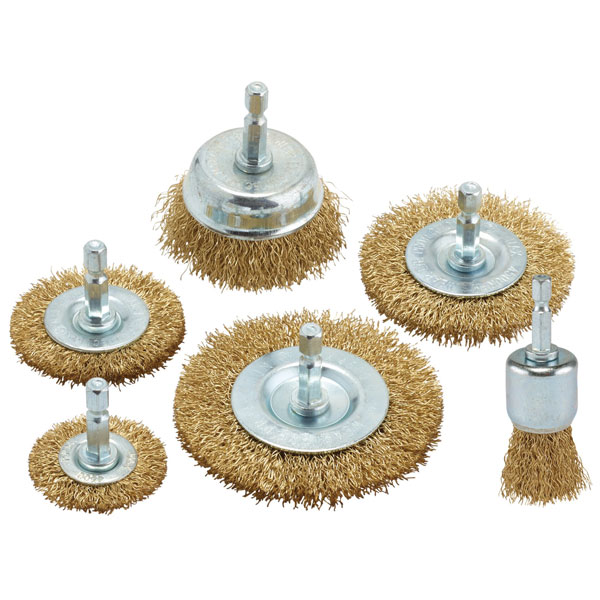 The set includes a 25mm wire end brush, 75mm wire cup brush, and three wire wheel brushes (50, 75, 100mm).