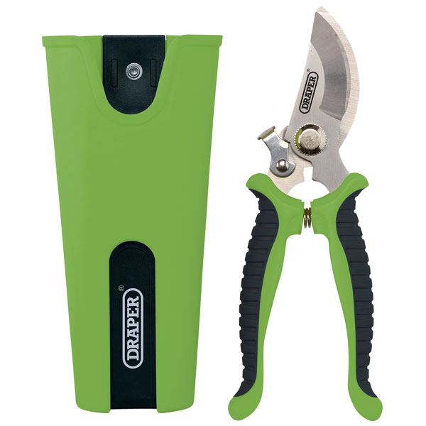 The Draper 09007 Bypass Secateurs and Holster Set contains a pair of 190mm bypass secateurs along with a convenient storage case with belt clip.
