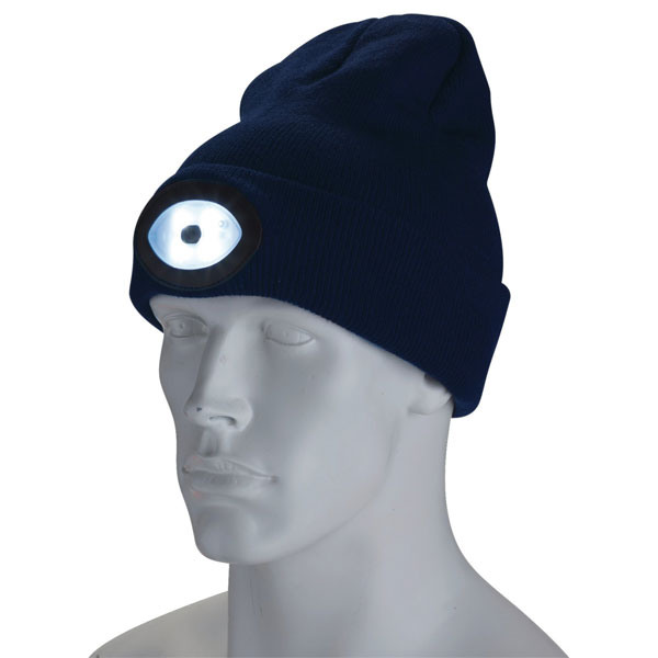 This cosy navy blue beanie hat has a built-in USB rechargeable LED headlight.