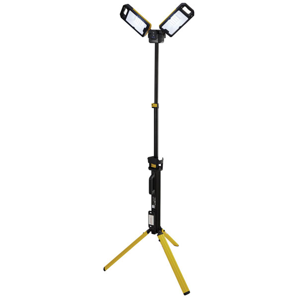 This rechargeable LED site light has a 360° multi-angle twin head and a self-locking tripod stand.