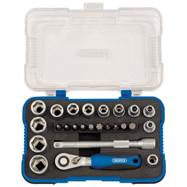 Six point sockets made from chrome vanadium steel that's hardened and tempered with a satin finish. Supplied with a 72 tooth reversible soft grip ratchet and accessories. Packed in a plastic storage case.