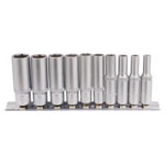 6 pint deep sockets manufactured from chrome vanadium steel, hardened and tempered with a satin finish. Each socket has a knurled ring for extra grip. Supplied on a metal socket rail for secure storage. Display packed.
