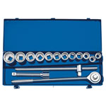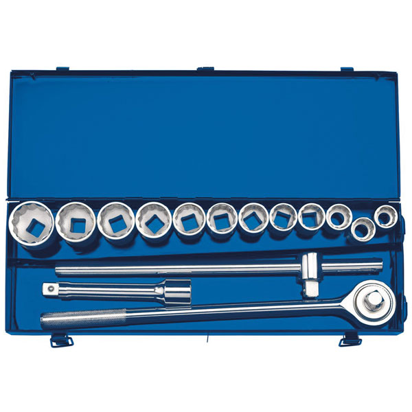 Socket set manufactured from carbon steel hardened and tempered with a polished finish. Packed in metal carrying case.