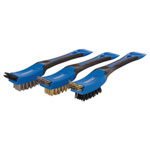 Three 210mm brushes fitted with either robust Nylon, Stainless Steel or Brass bristles, capable of delivering a vigorous scrub and clean. Each brush has two bristle groups in alternative material. The soft grip handle is tapered at the end enabling the handle to be used as a scraper.