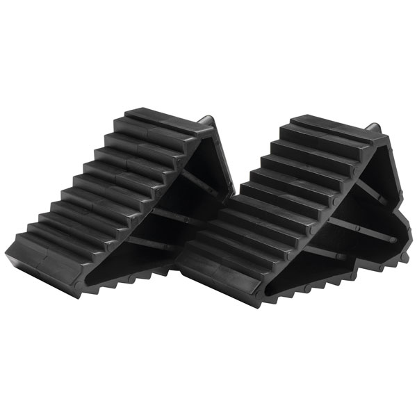 This pair of wheel chocks are made from heavy-duty moulded plastic to enhance traction between the tyre and surface.
