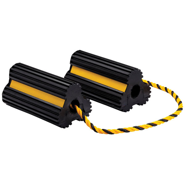 This pair of wheel chocks is constructed from heavy-duty moulded rubber to enhance traction between the tyre and surface.