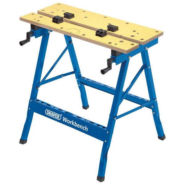 Portable workbench with dual clamping action and 35 holes for work clamping dogs. Folds flat for secure storage. Two - piece MDF worktop. Sturdy legs manufactured from strong box section steel. Maximum clamping width with dogs 430mm. Supplied with four plastic clamping dogs and fixings. Weight 11.5kg.(approx.). Flat packed with assembly instructions. Display carton.