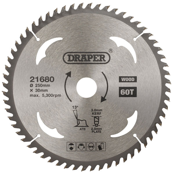 Draper 21680 TCT Circular Saw Blade for Wood, 250 x 30mm, 60T