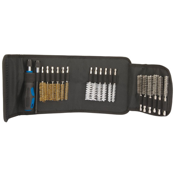 Suitable for a variety of uses including internal/external thread cleaning, cleaning drilled holes and cleaning small bore holes etc. Set comprises six nylon brushes, six stainless steel brushes, six brass brushes, soft grip magnetic handle and a 150mm magnetic extension. Supplied with canvas fold up case. Display packed.