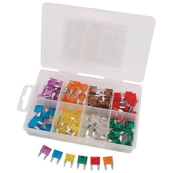 Assortment of mini automotive fuses in plastic storage case. Assortment includes fuses of ratings: 3A, 5A, 7.5A, 10A, 15A, 20A, 25A and 30A. Display carton.