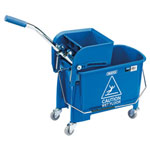 Side press wringer provides equal pressure on mop heads. Suitable for use with all flat mops including Draper Kentucky Mops Stock Nos. 24825 and 24826. Fitted with side fitting metal handle and 50mm castors for easy portability. Wet floor warning sign printed on bucket sides. Carton packed.