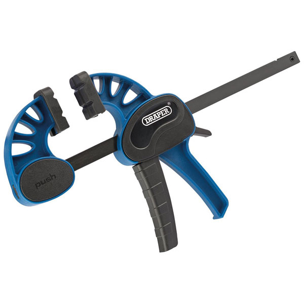 Single-handed versatile clamp for spreading and clamping. Ratchet action trigger with quick-release button and ergonomic handles. Display packed.