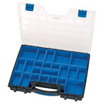 Plastic organiser with an adjustable matrix of lift - out storage compartments. Case has a carrying handle with 'snap fit' closures and clear lid. Sold loose.