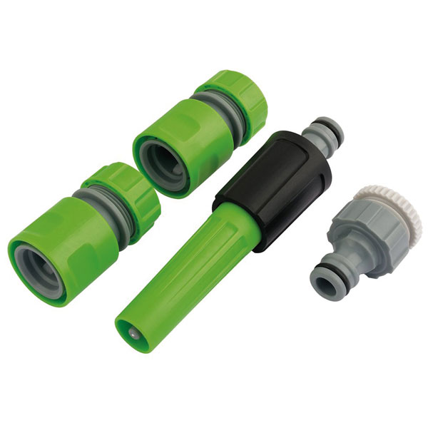 Watering set, comprising off an adjustable hose nozzle, tap connector for 1/2" or 3/4" tap and a pair of 1/2" hose connectors, one with water-stop feature.
