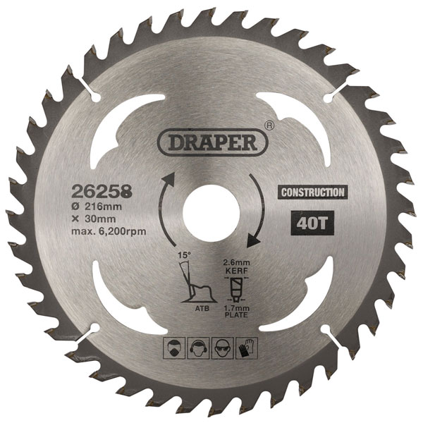 Draper 26258 TCT Construction Circular Saw Blade, 216 x 30mm, 40T