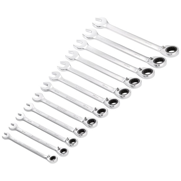 These Draper HI-TORQ® metric reversible ratchet combination spanners are forged from chrome vanadium steel that is hardened, tempered, fully polished and mirror chrome plated for corrosion protection.
