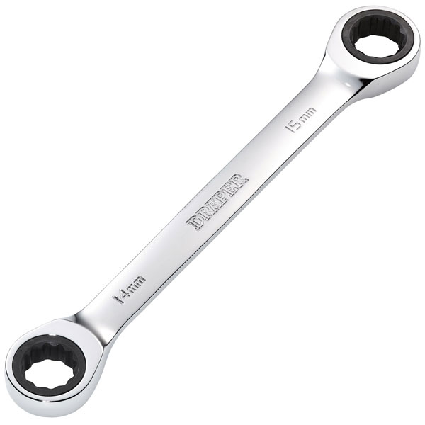 This Draper HI-TORQ® metric double ratchet ring spanner is forged from chrome vanadium steel that is hardened, tempered, fully polished and mirror chrome plated for corrosion protection.