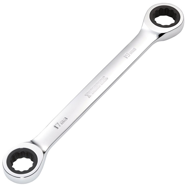 This Draper HI-TORQ® metric double ratchet ring spanner is forged from chrome vanadium steel that is hardened, tempered, fully polished and mirror chrome plated for corrosion protection.